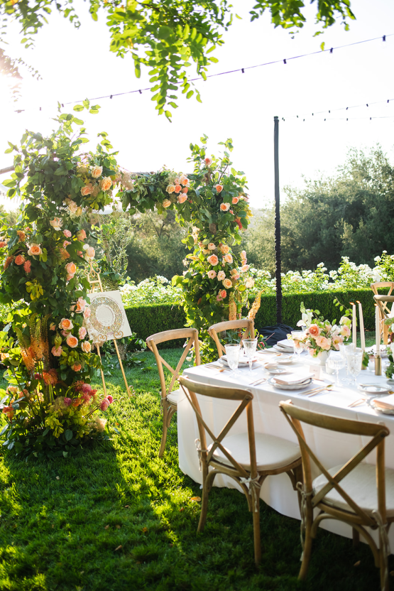 Accentuating the gorgeous lawn and gardens of this private Westlake Village, LA estate, this summertime wedding pops with color. Not just the whimsical chuppah jumps off the page. The couple, their planner A Signature Wedding and florist Emblem Flowers incorporated arrangements featuring unripened green tomatoes, kumquats, blueberry branches, and other edible plants which kept the tables playful yet elegant.